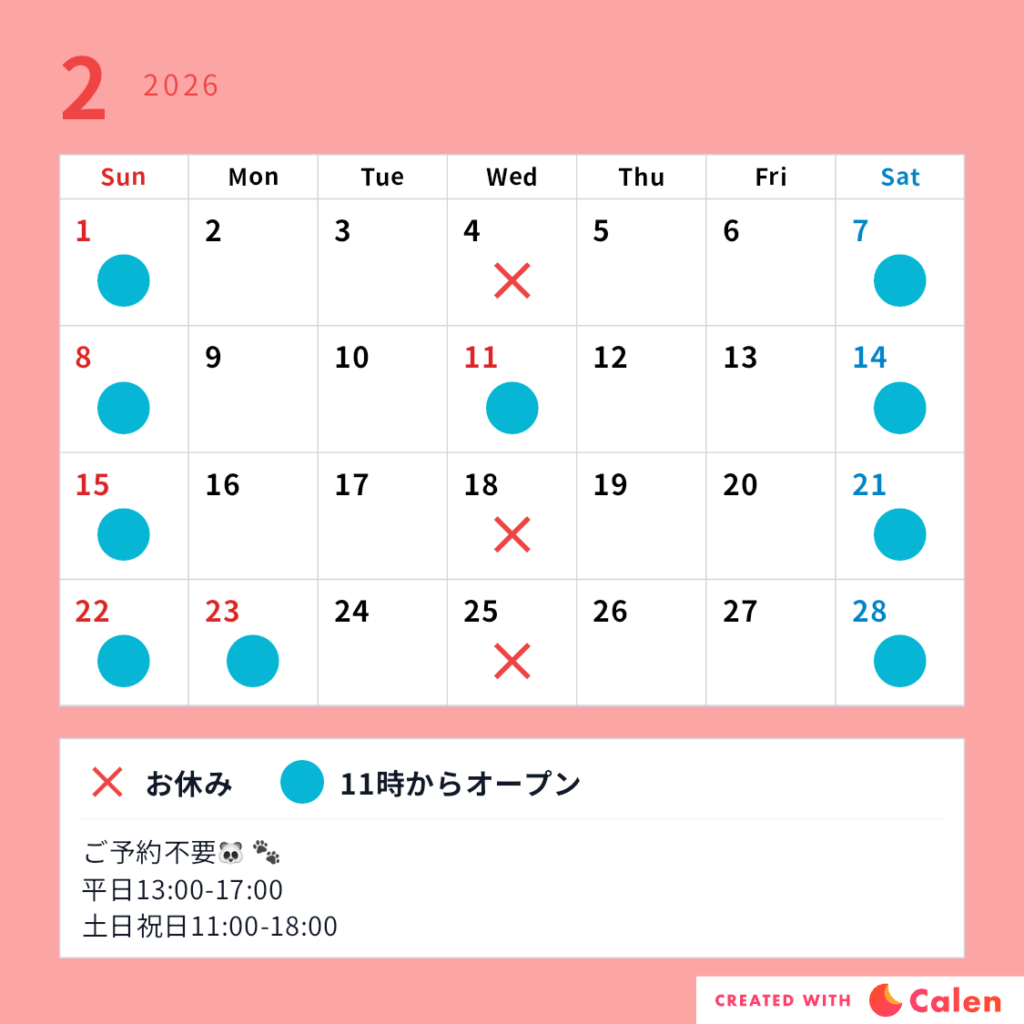 2026年1月15日 / 最終更新日時 : 2026年1月30日 広報担当 お知らせ 2月の営業日のお知らせ 2/11日(水)は祝日のため特別営業日11時からOpenです。 ご来店お待ちしてます。 FacebookXBlueskyHatenaLINECopy
